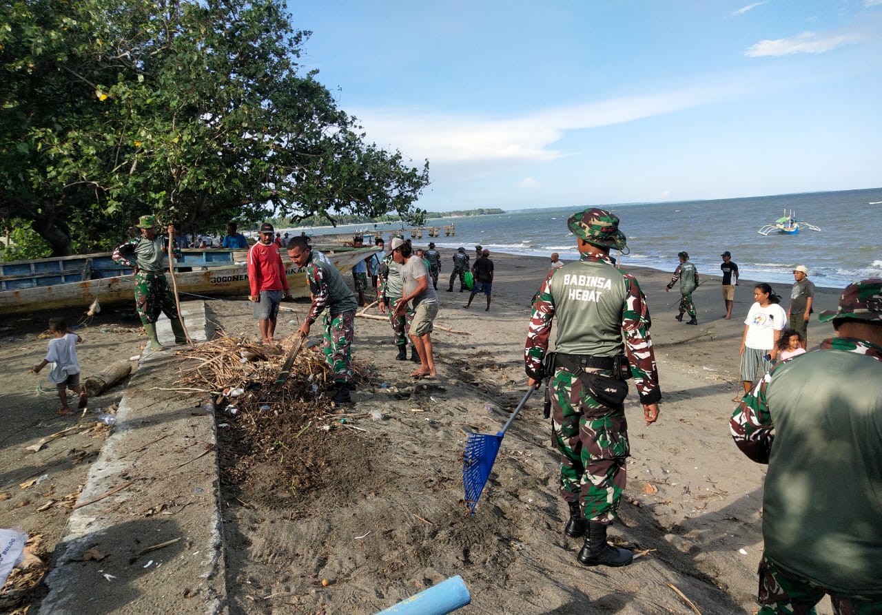 TOBELO- Koramil 1508-03/Kao bersama Pemerintah Desa serta warga melaksanakan kegiatan pembersihan pantai di Desa Kao Kecamatan Kao Kabupaten Halmahera Utara, Kamis (11/01/2024).