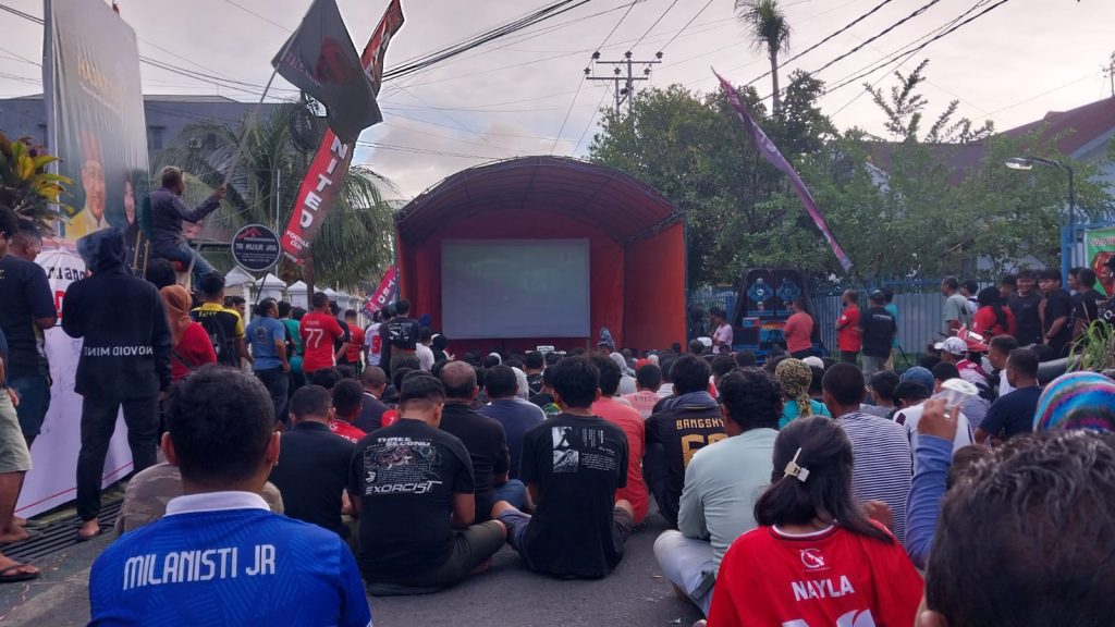 Ratusan pendukung Malut United menggelar nonton bareng saat tim Malut United vs Deltras di Kota Baru Ternate (3/2/2024) Sore