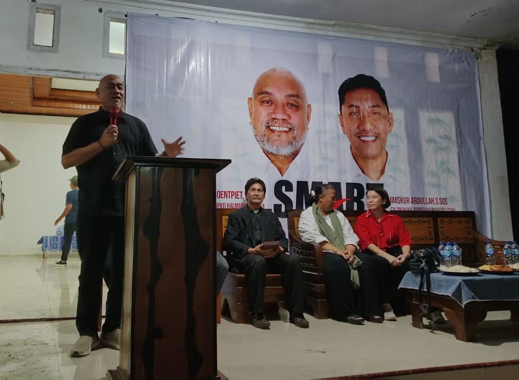 TOBELO, MPe – Pasangan Calon Bupati dan Wakil Bupati Halmahera Utara (Halut) Steward Soentpiet dan Maskur A. Tomagola (SMART) tiba bersama rombongan sekitar pukul 21.00 Wit di posko pemenangan yang terletak di Desa Gamsungi depan Kantor Bupati setempat.