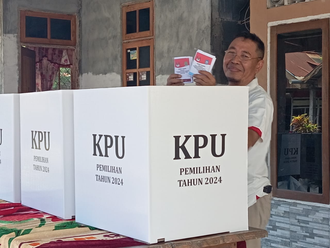 TOBELO- Calon Bupati kabupaten Halmahera Utara (Halut) nomor urut 01, Muchlis Tapi Tapi bersama istri melakukan pencoblosan di TPS 4 yang terletak di kompleks marimoi desa Gamsungi kecamatan Tobelo sekitar pukul 11.40 Wit. Rabu (27/11/2024)