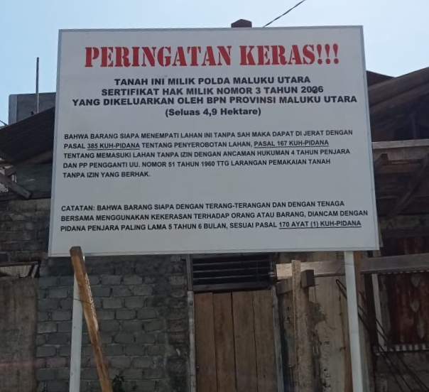Plang berisi informasi bahwa tanah seluas 4,9 hektar di areal sini milik Polda Malut bersertifikat hak milik Nomor : 3 tahun 2006 yang dikeluarkan Badan Pertanahan Nasional (BPN) Malut.