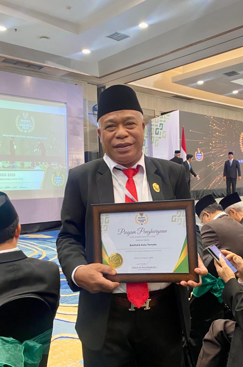 Penyerahan penghargaan dilakukan langsung Ketua Baznas Republik Indonesia Prof. DR. Noor Achmad, MA dan diterima Wakil Ketua Baznas Kota Ternate H. Mu’min Arif, SH MH dalam acara Baznas Award 2025, Kamis (28/8) di Mercure Convention Center Ancol, Jakarta.
