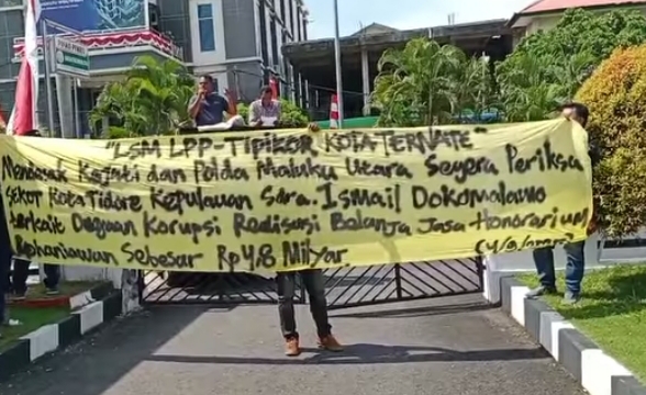 Dengan membawa spanduk bertuliskan ‘ LPP-TIPIKOR Kota Ternate Mendesak Polda dan Kejati Maluku Utara Segera Periksa Sekkot Tidore Kepulauan, I.D alias Ismail terkait dugaan korupsi realisasi belanja honorarium rohaniawan sebesar Rp 4,8 Miliar’